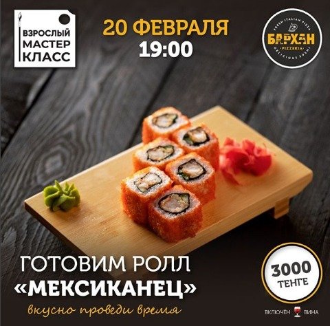 В этот день мы будем готовить аппетитный ролл "Мексиканец" в приятной компании, за веселыми разговорами и бокалом пикантного напитка! У нас вы сможете провести время интересно, нестандартно, а самое главное — вкусно!