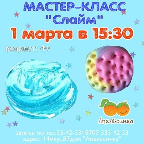 Детский развивающий центр "Апельсинка" приглашает на мастер-класс по изготовлению слайма.