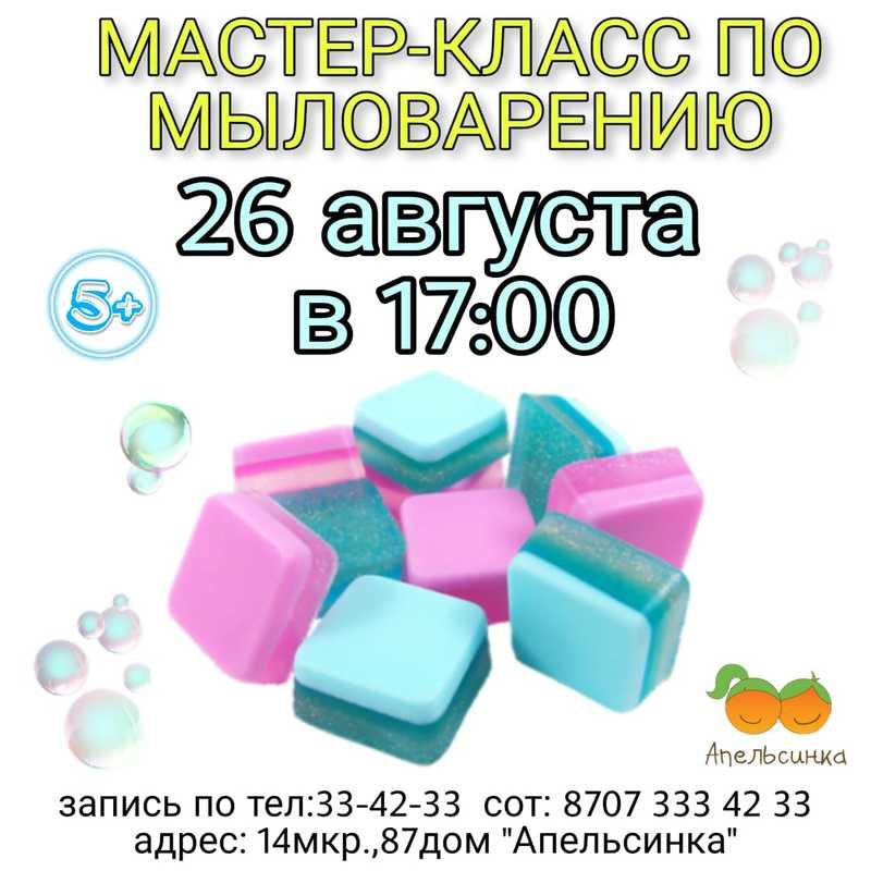 26 августа детский центр Апельсинка приглашает на мастер-класс "Мыловарение". Возраст 5+, начало в 17:00.