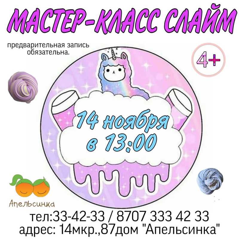 Центр Апельсинка приглашает на мастер-класс по изготовлению слайма для детей старше 4 лет. Начало 14 ноября в 13:00. Предварительная запись по телефонам 334233, +7 707 3334233