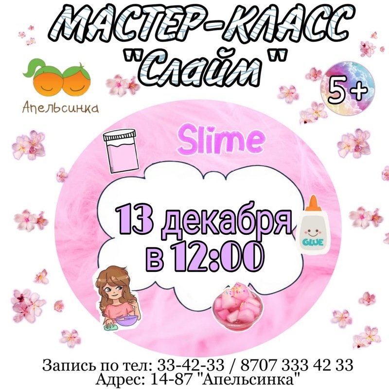 Апельсинка приглашает на мастер-класс по изготовлению слайма. Предварительная запись по телефонам 334233, +7 707 3334233