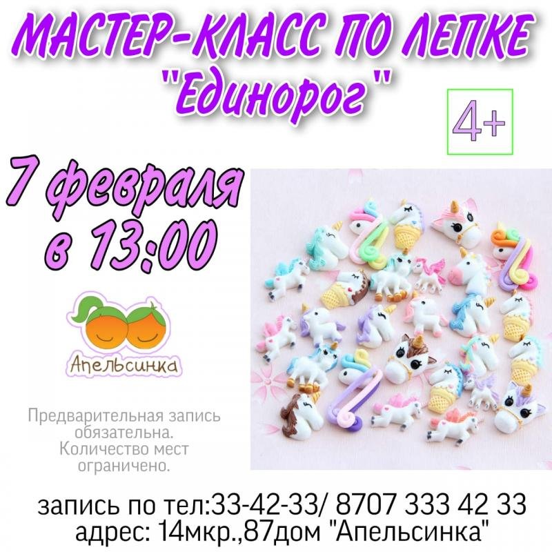 Центр Апельсинка приглашает на мастер-класс по лепке "Единорог" для детей старше 4 лет. Предварительная запись по телефонам 334233, +7 707 3334233
