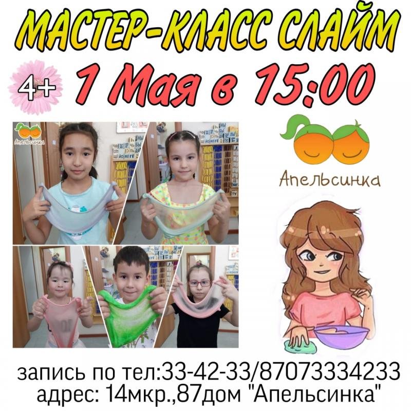 Центр "Апельсинка" приглашает на мастер-класс по изготовлению слайма, который пройдет 01 мая в 15:00. Предварительная запись по телефонам +7 707 3334233, 334233