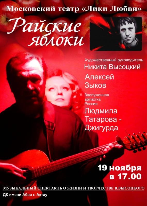 Спектакль «Райские яблоки» был поставлен в 2005 году режиссером Рашидом Тугушевым. Художественным руководителем постановки является Никита Высоцкий. Премьеру спектакля многие оценили высоко, а газета «Московский комсомолец» назвала спектакль «лучшим, из когда-либо поставленного о Высоцком...».За эти годы «Райские яблоки» увидели во многих городах России и стран СНГ, Прибалтики, а также поклонники Высоцкого в Польше, Словакии, Австралии и Франции. Сразу после премьеры спектакль имел огромный резонанс за рубежом. Двухмесячный гастрольный тур с триумфальным успехом прошел по крупнейшим городам США.