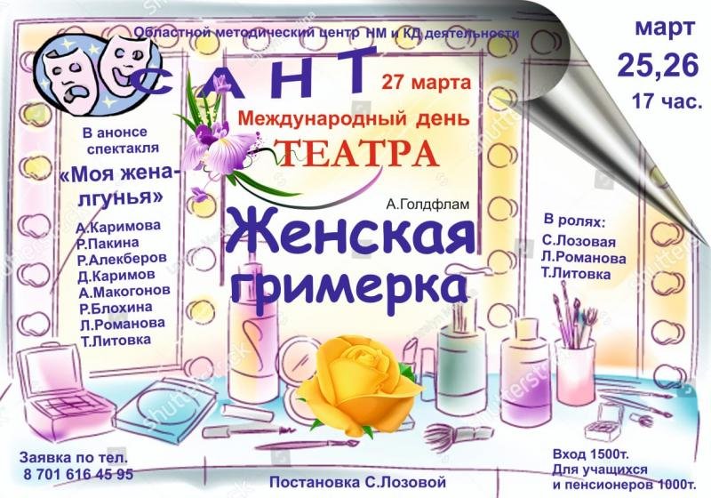 В честь Международного дня театра, который празднуется 27 марта, областной методический центр НМ и КД деятельности «САНТ» приглашает жителей и гостей Актау на спектакль «Женская гримерка».