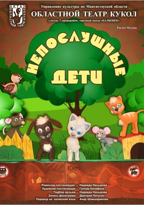 Спектакль «Непослушные дети» поставлен по пьесе Рагима Мусаева «Мяу, гав, чик-чирик». Этот спектакль обращен к дошкольникам и младшим школьникам.