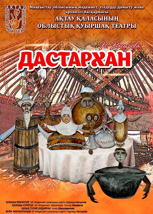 «Дастархан» спектаклінде, сол көшіп-қонуға арналған киіз үйдің ішіндегі күнделікті пайдаланылатын ыдыс-аяқтар арасындағы өзара келіспеушілік болып, үй иесін кешкі ассыз қалдырады.