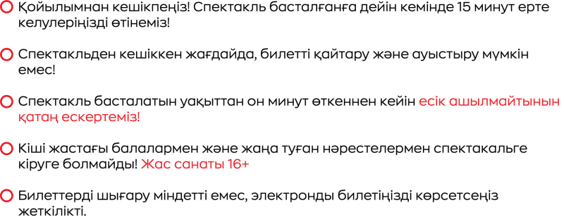 Дополнительно: Спектакль на казахском языке. С детьми младшего возраста и новорожденными вход на спектакль запрещен! Возрастное ограничение 16+