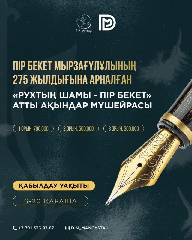 В рамках государственного социального заказа управления по делам религий Мангистауской области среди поэтов пройдёт областной конкурс «Рухтың шамы — Пір Бекет», посвящённый 275-летию Пира Бекета Мырзагулулы.