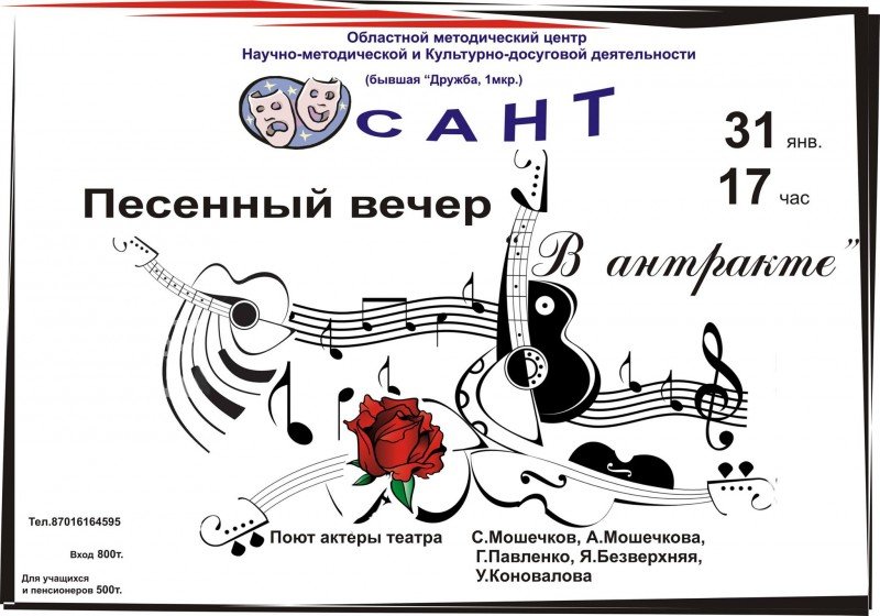 Песенный вечер "В антракте" пройдет в ОМЦ Научно-методической и Культурно-досуговой деятельности ( бывшая "Дружба" 1 мкр.).