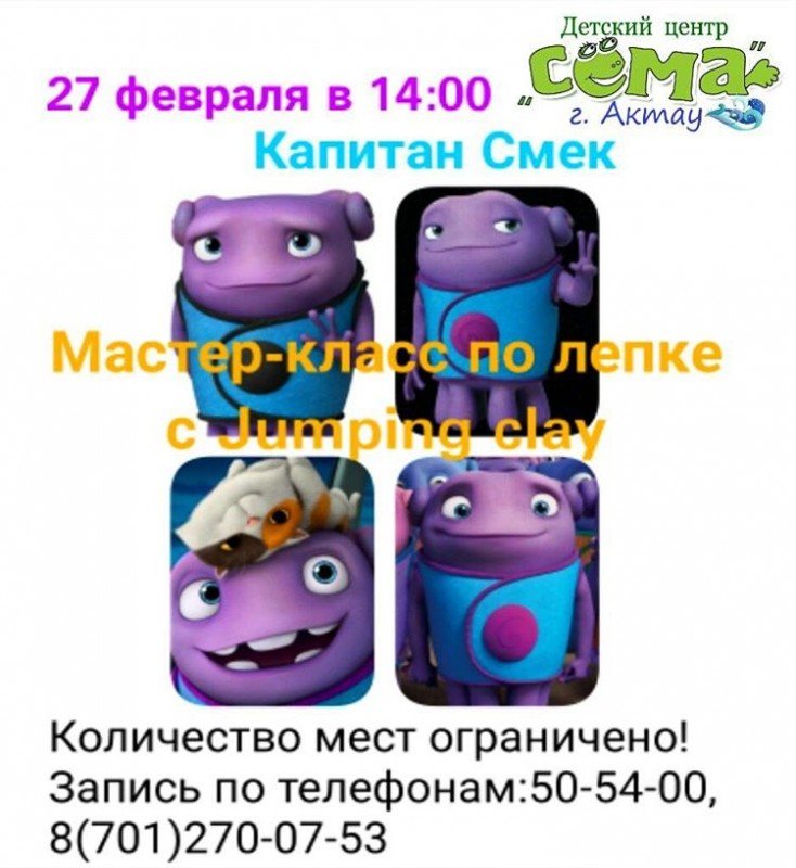 Приглашаем всех желающих на мастер-класс по лепке из волшебной глины Джампинг Клэй героя мультфильма "Дом"-Капитана Смека в эту субботу в 14:00!