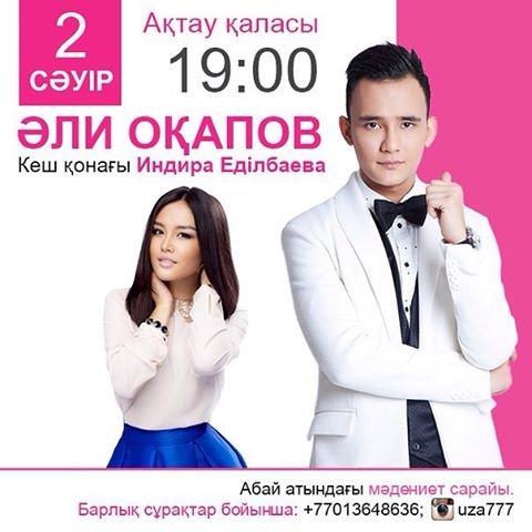 Специально приглашенной гостьей стала Индира Едильбаева - финалистка музыкального проекта «Қазақстан дауысы». В городе Жанаозен концерт Али Окапова пройдет в концертном зале «Мунайшы» 3 апреля в 19:00