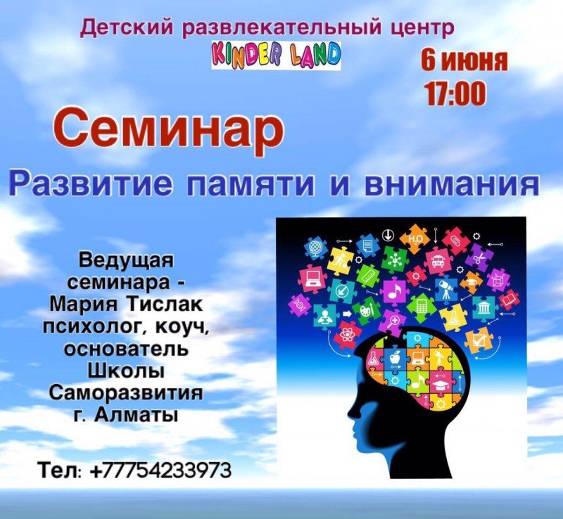 6 июня 17:00 в Детском развлекательном центре Kinder land Семинар коуча и тренера по развитию памяти и внимания , а также по подготовке к ЕНТ из г. Алматы Марии Тислак. Cеминар «Развитие памяти и внимания"