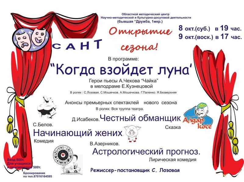 Анонсы премьерных спектаклей нового сезона: "Честный обманщик" по пьесе Д.Исабекова. Сказка. "Начинающий жених" по пьесе С.Белова. Комедия. "Астрологический прогноз" по пьесе В.Азерникова. Лирическая комедия. В анонсах занята вся труппа театра. Режиссер театра С.Лозовая.