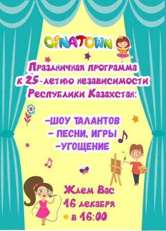 В Семейно-развлекательном центре Oinatown (Ойнатаун) пройдет праздничная программа, посвященная 25-летию Независимости Республики Казахстан.