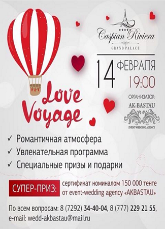 Следуя нашим традициям, мы приглашаем ВСЕХ на самый романтичный вечер с очень увлекательной программой "LOVE VOYAGE!", в самом "сердце" нашего города - отеле "Caspian Riviera Grand Palace"!