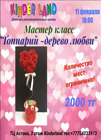 Детский развлекательный центр "Kinderland" приглашает на мастер-класс "Топиарий -дерево любви". Продолжительность мастер-класса 60 минут.