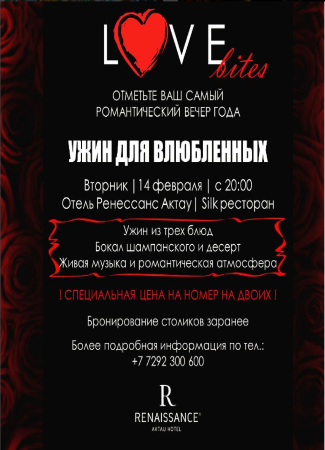 Друзья, в самый романтический вечер года отель Ренессанс Актау приглашает всех влюбленных в ресторан Силк!