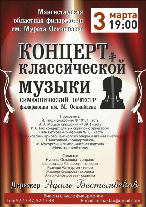 Большой зал Мангистауской областной филармонии им. Мурата Оскинбаева приглашает вас на концерт симфонического оркестра.