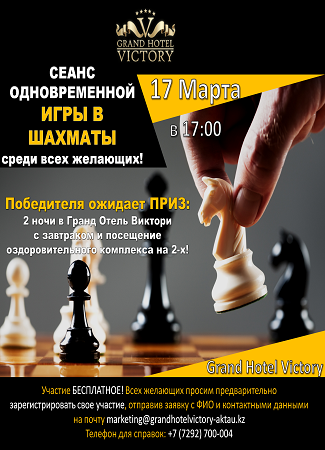 В рамках празднования 10-летия, гостиница Grand Hotel Victory приглашает всех шахматистов-любителей принять участие в сеансе одновременной игры в шахматы. Вы сможете не только показать свои навыки и уровень игры, но также сразиться с победителем множества республиканских соревнований, кандидатом в мастера спорта по шахматам Шайхымовым Анваром и юными титулованными воспитанниками школы шахмат "Дебют".