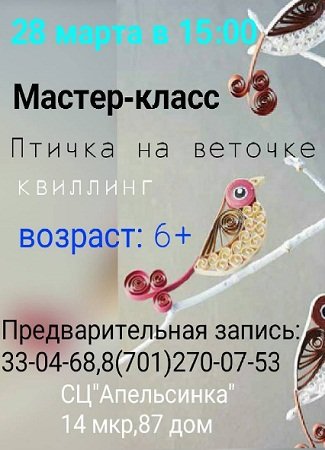 "Апельсинка" приглашает на мастер-класс по квиллингу "Птичка на веточке".