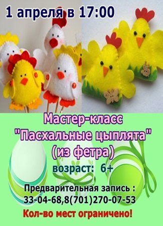 В семейном центре "Апельсинка" состоится мастер-класс "Пасхальные цыплята" (из фетра).