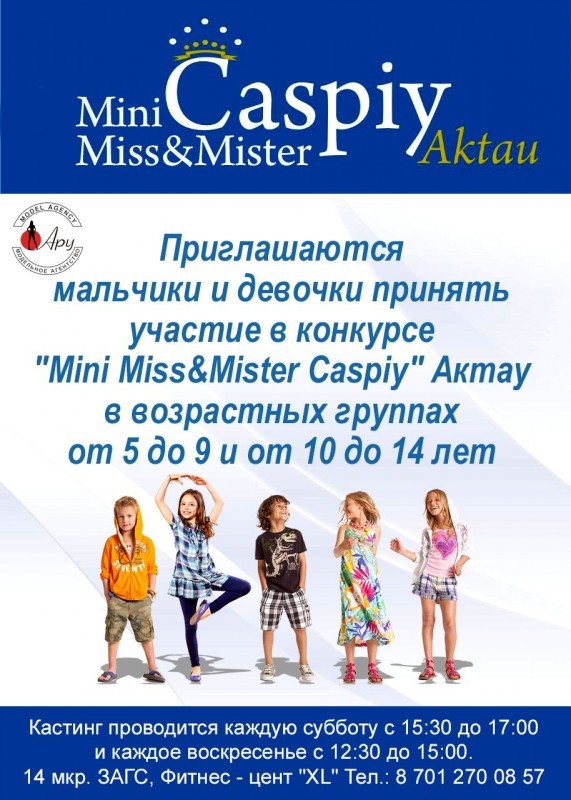 Организаторы конкурса "Mini Miss&Mister Caspiy" приглашают девочек и мальчиков принять участие в конкурсе в возрастных группах от 5 до 9 лет, от 10 до 14 лет.