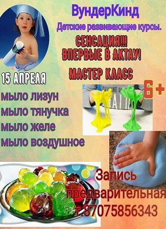 Впервые в Актау детские развивающие курсы "ВундерКинд" приглашает детей по изготовлению мыла-тянучки, мыла-лизуна, мыла-желе и воздушного мыла.