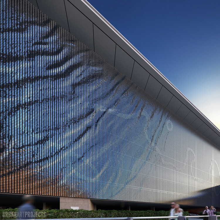 Ещё более масштабный пример — кинетический фасад парковки Brisbane Airport в Австралии. Фасад здания состоит примерно из 250 000 алюминиевых панелей, каждая из которых свободно вращается под воздействием ветра. В результате весь фасад превращается в гигантскую динамическую поверхность.