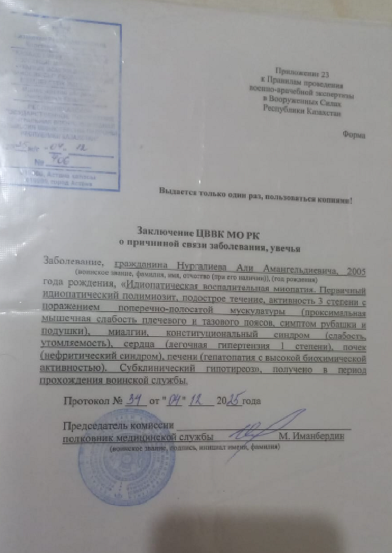 У Али Нургалиева поражены некоторые внутренние органы и диагностировано тяжёлое аутоиммунное заболевание. Таким он вернулся со службы в армии. Сейчас семья пытается добиться справедливости и помощи от военных и неравнодушных людей.
