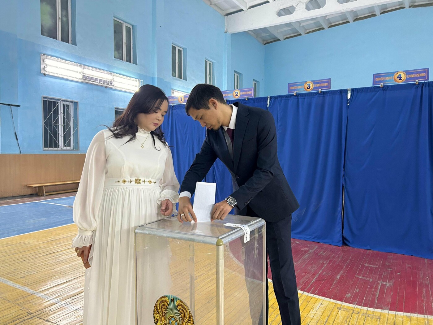 Сегодня на референдуме молодая супружеская пара Асқарбек Чогданбаев и Наурызгүл Тәжедин проголосовали на избирательном участке №203, расположенном в средней школе №9 села Баскудык Мунайлинского района.