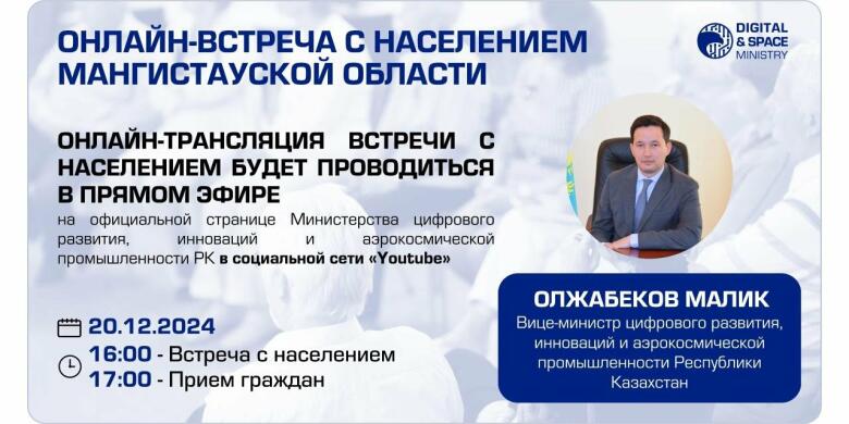 20 декабря в 16.00 часов вице-министр цифрового развития, инноваций и аэрокосмической промышленности РК Малик Олжабеков проведет онлайн встречу с населением Мангистауской области, и в 17.00 часов проведёт прием граждан по вопросам, входящим в компетенцию министерства. Записаться на личный прием, а также вопросы и предложения принимаются по номеру: 8-7292462111(1087) (в рабочее время). Онлайн-трансляция встречи с населением будет проводиться в прямом эфире...